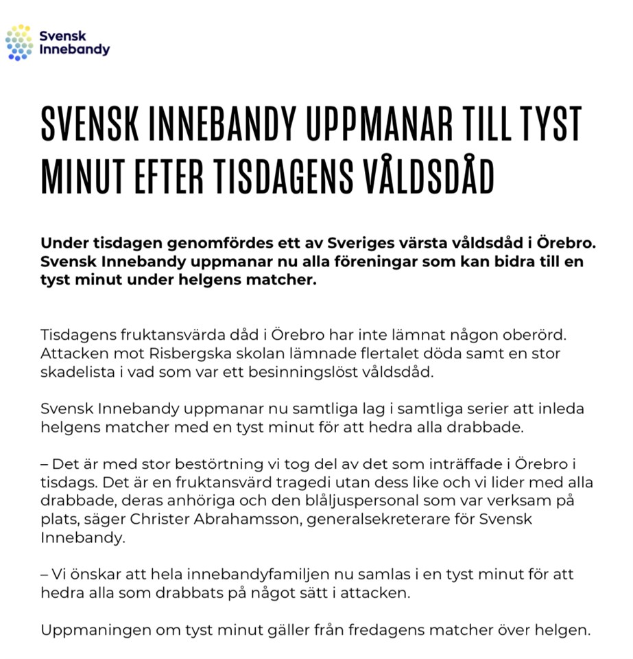 Vi uppmanar all lag som kan att följa innebandyförbundets uppmaning om en tyst minut vid helgens matcher för att hedra alla drabbade från våldsdådet i Örebro.